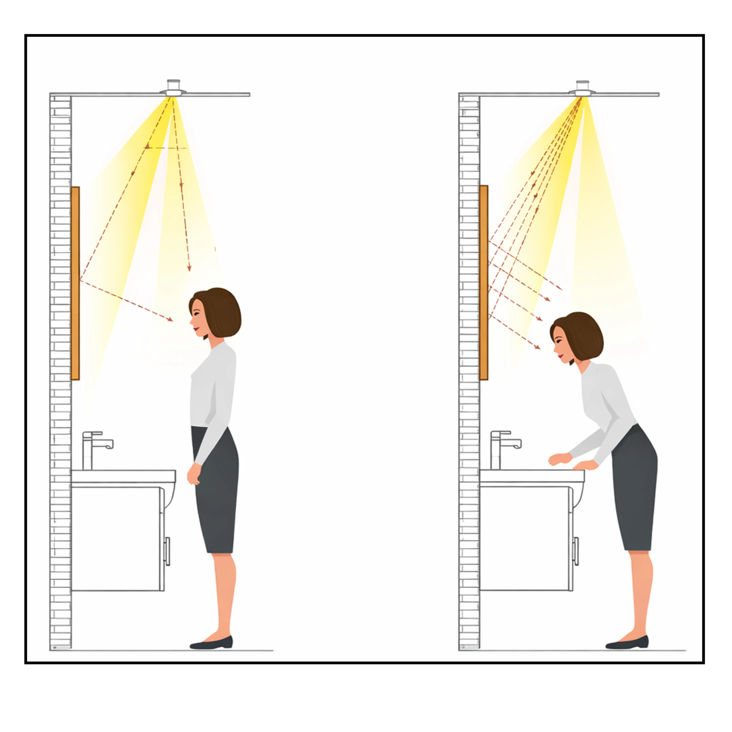 - Specialized Wall Washer Lens for Mirrors: The luminaire features a unique wall washer lens specifically calibrated for mirror lighting. It casts a wide, even sheet of light downwards, ensuring the face is illuminated from the front and sides, which prevents the harsh overhead shadows created by standard downlights. – Powerful Yet Elegant Performance: The 13W module delivers the ideal brightness for tasks like makeup application and grooming. It combines high-quality, energy-efficient output with a soft, diffused quality of light that is both functional and comfortable.
